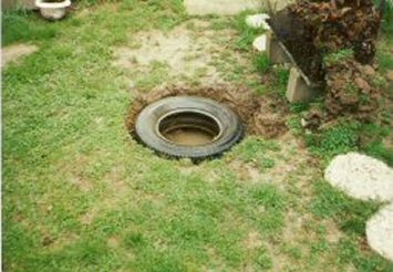 My experience in the use of old tires was begun in 1996. Three used fifteen inch tires were placed in an area where runoff from a neighbors' gutter had created an excess of water. The cutting of large holes