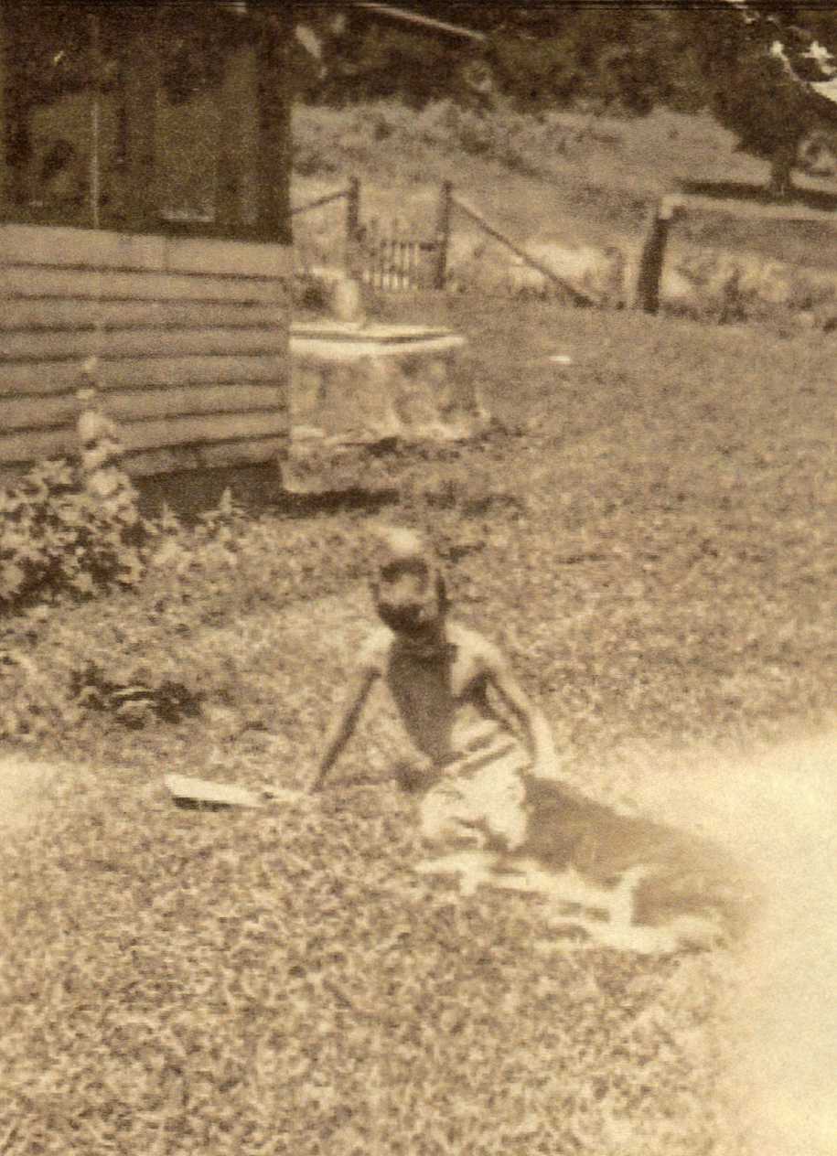 The dog, Jack and George Harold Fulks, at Carie Atlantic Gerthie Dell Pinegar Fulks' farm five miles Northeast of Golden Pond, Kentucky. Subject is about eleven years old. Within the household with Grandmother were Wilmus Avel and Herbert Buford